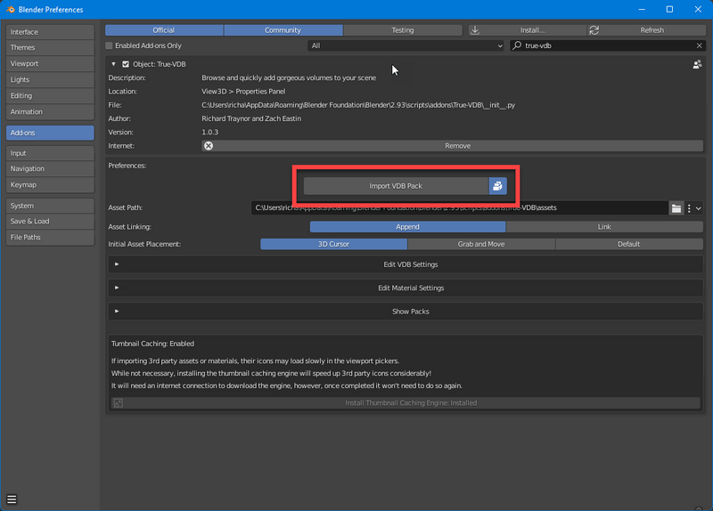After completing the installation of the TrueVDB addon, follow these instructions to install the content packs: