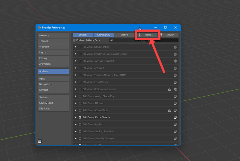 Click the "Install Addon" button in the bottom right corner of the window (highlighted in blue).